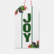 Das Wort "JOY" ist in einem grün-schwarzen Karo mit zwei grün gezeichneten Linien auf beiden Seiten. In den gegenüberliegenden Ecken gibt es heilige, rote Beeren und Kiefernzapfen. Eine kleinere Version des Designs befindet sich auf der Rückseite, mit einem Bereich für benutzerdefinierten Text.