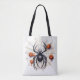 Auf dieser einzigartigen Totentasche hat eine riesige schwarze Witwenspinne orangefarbene Kürbis in ihr Netz gefangen. Geeignet für die Halloween-Saison, aber könnte das ganze Jahr verwendet werden. Das gleiche Bild wird auf beiden Seiten der Tasche gedruckt.