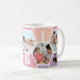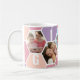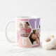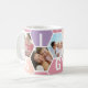 Honigwabenkaffee-Tasse, personalisiert mit 5 Ihrer Lieblings-Fotos und gedruckt mit einem 4-Buchstaben-Namen, wie z.B. GIGI. Das Design ist mit einer Collage aus Wabenkrauben in einer sommerlichen Sorbet-Farbpalette aus lila Rosa und Pfirsich mit einer niedlichen kleinen Biene gestaltet. Wenn Sie gewollt haben, die Farben zu ändern, klicken Sie auf "Weiter anpassen" und klicken Sie auf jedes Hexagon, das Sie gewollt haben, um zu ändern.