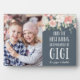 Nur die besten Mütter werden nach Gigi befördert! Teilen Sie den Tag der Mutter mit dieser schönen Foto-Plakette, die ein wertvolles Foto ihres Enkels oder ihrer Enkel zeigt. Persönlich mit ihren Namen auf der rechten Seite, in weißer Schrift auf einem eleganten, blau-schieferfarbenen Hintergrund mit pfirsichfarbenen und rot-rosa Blume und grünem Blattwerk.