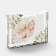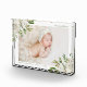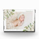 Personalisiertes Foto blockiert die Beibehaltung Ihres Fotos, Name und Geburtsdaten Ihres Neugeborenen oder anderer benutzerdefinierter Texte. Elegantes feminines Design mit einer bemalten, blumengeschmückten Wasserfarbe, weißen Blume und grünem und goldgelbem Blattwerk. Verwenden Sie die Entwurfswerkzeuge, um die Textfarben und Schriftart zu bearbeiten oder um weitere Fotos hinzuzufügen, um einen ähnlichen Stil zu erstellen.