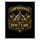 A bold, gold-on-black art deco emblem of towering skyscrapers and factories symbolizing ruthless corporate power.
