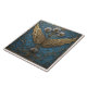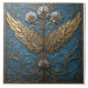 Eine symmetrische Komposition auf einem quadratisch-blauen Hintergrund, gerahmt mit einem goldenen Rahmen, weist ein zentrales Design auf, das an einen Baum erinnert, dessen goldene Flügel sich von seinem Kofferraum abheben. Die Zweige des Baumes sind mit silbernen Blume mit goldenen Mittelpunkten und goldenen filigranen Wirbel rund um das Hauptmotiv geschmückt, was dem Gesamtdesign eine verzierte Touch verleiht.