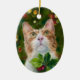 Dieses Urlaubssornament zeigt meine ursprünglich in sanften Pastellfarben erschaffenen Kunstwerke, die ein orangefarbenes und weißes Kätzchen darstellen, das vor den Urlaubserscheinungen mit Heiligem im Vordergrund nach oben blickt.