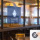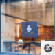 Ein dekoratives Ingwer-Glas, das mit einem dekorativen, weiß-blauen Muster gefüllt ist, verleiht diesem personalisierten Fensterdekor eine weltoffene Eleganz. Eine großartige Beschilderung für Boutiquen, Fachgeschäfte, Innenausstattungsstudios, kreative Räume und vieles mehr. © 1201AM Design Studio | www.1201am.com