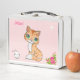 Niedliche Ingwer Kitty Cat, pinkfarbene Blume, eine weiße Maus und Stern auf hellkorallenrosa Lunch Box. Mimi-Name kann personalisiert sein.