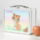 Niedliche Ingwer Kitty Cat, pinkfarbene Blume, eine weiße Glücksmaus und Stern auf Pastellfarben schattet Lunch Box. Name kann personalisiert sein.