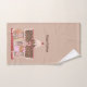Gingerbrot Girl und Weihnachts Candy House Handtuch. Ein wunderschönes Lebkuchenhaus und stolzer Besitzer mit den größten Augen und Lächeln, in dem Sie einladen. Die Zuhause ist mit rosa Zuckerguss und Bonbons mit einer riesigen Eistüte auf dem Dach bestückt. Bearbeiten Sie den Gruß nach eigener Wahl. Auf Wunsch können Sie die Farbe des Hintergrunds ändern, um die Gestaltung und den Stil Ihres Aufenthalts zu berücksichtigen.