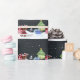 Ein süßes Lebkuchenmädchen mit einem rosa Geschenk, das auf dem Schnee zu einem grünen Weihnachtsbaum geht, mit blauen Geschenken an seinem Fuß. Schneefall gegen einen Nachthimmel und ein Nordpol-Schild. Lebkuchenmädchen von Whispys D'zines. Design von Iggys_World