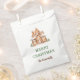 Weihnachts-Gastgeschenk-Tasche mit einem Lebkuchenhaus. Ideal für ein Party mit Lebkuchendekor. Die Wörter können geändert werden, um Ihre eigenen Angaben oder Anforderungen Anzug