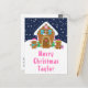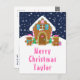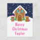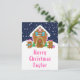 Diese lustige und festliche Urlaubskarte kann mit einem Namen oder Titel, wie Tochter, Enkelin, Nichte, Freund etc. personalisiert werden. Es verfügt über ein niedliches Lebkuchenhaus, das mit rosa und grünen Süßigkeiten dekoriert ist. Daneben sind bezaubernde Lebkuchenmänner mit Geschenken, in Weihnachtsmannmützen und Schal gekleidet. Im Hintergrund ist ein marinebrosa Winterhimmel mit eleganten fallenden Schneeflocken. Der Text verbindet dekorative und serifenlose Schriftart für einen stilvollen und modernen Look. Dies ist ideal für ein Weihnachtsgebäck mit Party.