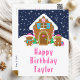 Diese niedliche und festliche Geburtstagskarte kann mit einem Namen oder Titel wie Tochter, Enkelin, Nichte, Freund etc. personalisiert werden. Das Design umfasst ein niedliches Lebkuchenhaus, das mit rosa und grünen Weihnachtskerzen dekoriert ist. Daneben sind bezaubernde Lebkuchenmänner mit Geschenken, in Weihnachtsmannmützen und Schal gekleidet. Im Hintergrund ist ein marineblauer Winterhimmel mit eleganten fallenden Schneeflocken. Der Text ist in einem kühlen und festlichen Schriftart. Dies ist ideal für Weihnachten und den Winterurlaub.