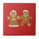 Lebkuchen mit weißem Zuckerguss Keks Mann und Frau Paar halten die Hände für den Weihnachtsfeiertag. Holen Sie sich dieses niedliche Paar, um Ihre Saison hell mit einem traditionellen Weihnachtsbild auf einem hellen fröhlichen roten Hintergrund zu machen.