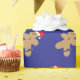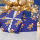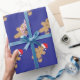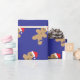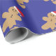 Funny und niedlicher Lebkuchen Mann Weihnachtsmusterverpackung Papier für festliche und moderne Geschenke. Blauer Hintergrund.