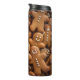 A cheerful Christmas illustration featuring a large, smiling gingerbread man with white icing accents and red candy buttons, wearing a striped bow tie. He stands in a snowy landscape with whimsical gingerbread houses, decorated trees, and falling red ornaments, capturing a sweet and joyful holiday atmosphere.
