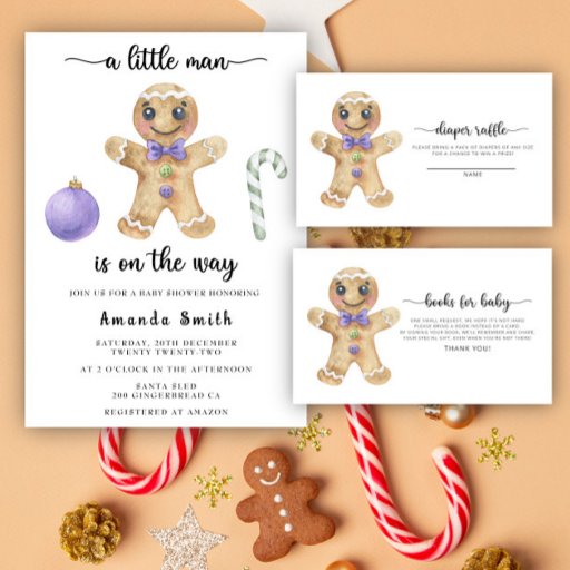 Gingerbread Mann Weihnachtsdusche Einladung. Aquarellkuchen mit Zuckerrohr und violettem Weihnachtsball. Matching-Elemente verfügbar.