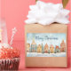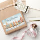 Eine hübsche Reihe von Lebkuchenhäusern zeigt süß über diesen Weihnachtsaufkleber. Dieses fröhliche Aquarellbild hat Vintagen Ursprung. Die schneebedeckte Winterszene beinhaltet "Frohe Weihnachten" in kontrastdunkelblauen Schriften, die Sie bearbeiten können, wenn Sie gewollt haben. Stellen Sie sicher, dass Sie die Namen "von" und auch das Datum ändern.