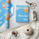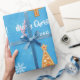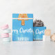 Moderne Weihnachtsgeschenkverpackung für Kinder mit einem eleganten Design, das einen Lebkuchenschneemann, Weihnachtsbaum und Weihnachten, Schneeflocken, den Gruß "Frohe Weihnachten" in stilvoller Typografie und einen personalisierten Namen beinhaltet. Auf blauem Hintergrund mit Schneeflocken.