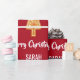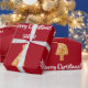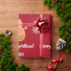 Moderne Weihnachtsgeschenkverpackung für Kinder mit einem eleganten Design, das einen Lebkuchenschneemann, Weihnachtsbaum und Weihnachten, Schneeflocken, den Gruß "Frohe Weihnachten" in stilvoller Typografie und einen personalisierten Namen beinhaltet. Auf einem roten Hintergrund.