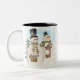 Ein Snowmannpaar mit schwarzen Top-Hüten, Lächeln, Winterschals und Lebkuchenjungen wird auf Gingerbrot Snowman T - Shirt, Grußkarten, Tasse, Mousepads, Knöpfe und mehr vorgestellt!