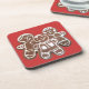 Fotografien von drei hausgemachten und dekorierten Lebkuchengebacken-Keksen auf Cranberry (anpassbar) Hintergrundfarbe.