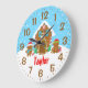 Diese niedliche und festliche Uhr kann mit einem Namen personalisiert werden. Das Design umfasst ein niedliches Lebkuchenhaus, das mit roten und grünen Weihnachtsliedern dekoriert ist. Daneben sind bezaubernde Lebkuchenmänner mit Geschenken, in Weihnachtsmannmützen und Schal gekleidet. Im Hintergrund ist ein hellblauer Winterhimmel mit eleganten fallenden Schneeflocken.
