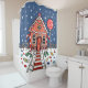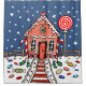 Eine farbenfrohe Abbildung eines festlichen Lebkuchenhauses. Im Außenbereich des Hauses gibt es zwei Süßspeisen und einen großen Lollipop-Baum im Garten. Der Boden ist mit hellen Weißzuckerschnee bedeckt und mit Süßigkeiten übersät.