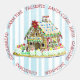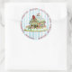 Blauer und farbenfroher Weihnachtsaufkleber mit einem knusprigen Lebkuchenhaus und blauen und weißen Streifen.