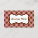 Rosa und brauner Gingham verleihen dieser Visitenkarte einen Retro-Stil. Passen Sie diese niedliche Visitenkarte an, um Ihren Bedürfnissen gerecht zu werden. Informationen hinzufügen oder löschen, den Stil des Schriftartes ändern, Größe des Schriftartes, etc... Das Design stammt aus der Originalkunst. Verwenden Sie diese stilvolle Visitenkarte für einen Salon, kleine Unternehmen, Wohngestaltung, Gourmet-Essen, Schokolade, Eisladen, Nagelsalon, Gasthaus, Innenarchitektur, Vorschulen, Kinderbetreuung, Geschenkartikelladen, Bed and Breakfast, Boutique, Café, Restaurant, Restaurant, Restaurant, usw..
