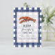 Eine rustikale nautische Hochzeit r.s.v.p. mit einer Illustration eines Hummers über einem verwitterten blau-weißen Gingham Hintergrund.
