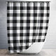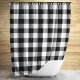 Schwarz-Weiß Gingham Muster Duschvorhang im Badezimmer Duschvorhang. Die Einrichtung ist in Schwarz-Weiß gehalten.