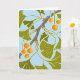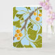 Kunst & Handwerk "Ginkgo Dance" Design leere Grußkarte. Dieses Blockdruckdesign zeichnet sich durch grüne Ginkgo-Blätter aus, die in einer Sommerbrise vor blauem Himmelshintergrund mit orangefarbenen und gelben Marmorfrüchten schwingen, die von schlanken grünen Hängeästen aufgehängt werden.