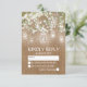 Twinkle Lichter Country Hochzeitskarten mit einem rustikalen braunen Einbrucheffekt-Hintergrund, eleganten Mason-Krug-Saitenleuchten, Baby-Atem-Blume und weißem Text.