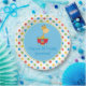 Diese Partyplatte kennzeichnet einen blauen Hintergrund, der durch einen wiederholenden Rüttler der roten, blauen, gelben und grünen Sterne umgeben wird. Eine niedliche Giraffe in einem roten Zugauto sitzt mitten in der Platte.
