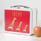 Dieses Design mit einem roten Hintergrund und Aquarellgiraffen ist ein toller Lunchkasten für die Schule. Personalisieren mit einem Namen.