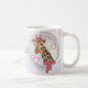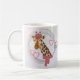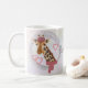 Giraffe mit Brille und roter Bettdecke. Kaffeetasse
