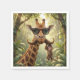Ein lebendiger Dschungel, in dem eine fantasievolle Giraffe einen großen Schnurrbart trägt, der spielerisch mit einem baumelnden Affen geschmückt ist, alles unter dem warmen Schein der Sonne