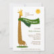 Diese niedliche und moderne Einladung ist ideal, um eine Babydusche mit Safari oder einem Zoo-Thema zu feiern. Es besitzt einen niedlichen Giraffencharakter mit einem Schal, der den Titel "Baby Shower" trägt, und einer glücklichen Sonne in der oberen rechten Ecke. Dieses einzigartige Design ist schick und attraktiv mit einem klaren Aussehen.