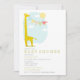 Eine neutrale Babydusche-Einladung mit einer Illustration einer Giraffe und eines roten Vogels, die zusammenarbeiten, um ein Banner zu halten, das "BABY" sagt. Passen Sie den Text mit Details zu Ihrem Anlass an.