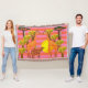 Farbenfrohe zeichn eines Kamels, Giraffen und Bäume auf dem Streifen Hintergrund. Lebhaftes Design auf der Krustendecke.
