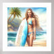 Künstlerisches Bild mit einem Mädchen und Surfbrett, die frei leben mit Sport und Spaß, in einer wunderschönen Landschaft der exotischen Natur.
