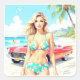 Girl am Strand mit einem klassischen Auto Quadratischer Aufkleber