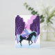 Digitale Abbildung zeigt einen schönen Mädchen-Bogenschütze mit rosa Haar. Sie hat einen Bogen und Pfeile hinter sich. Sie reitet auf einem schwarzen Pferd mit einer blauen Mähne unter den Bäumen in einem blühenden Wald. Illustration hat eine fabelhafte Farbe und Frühlingsstimmung