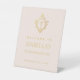 Ein religiöses Begrüßungszeichen in Rosa und Gold wird für ein Mädchen empfohlen. Über dem Text befindet sich ein Kreuz in einem Vintagen Wappen, beide aus Imitaten Goldfolie. Der Hintergrund ist rot, der gesamte Text ist goldfarben und kann geändert werden. Das Vintage Wappen aus einer alten Buchbinderei aus dem Buch "Rust, Smut Mildew & Mold" aus dem Jahre 1870, jetzt im öffentlichen Bereich.