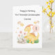 This birthday card is suitable for a granddaughter or daughter's first, 2nd or 3rd birthday. The design includes the number 1 (which can be changed or removed), birthday stars, watercolour grass, flowers and rocks, and a yellow and pink dinosaur with balloon.