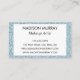 Diese schicke, gürtelige und gläserne Visitenkarte hat beidseitig einen hellblauen silbernen Glitzer-Glitzern-Hintergrund. Auf der Vorderseite der Visitenkarte steht Ihr Vorname in einem eleganten schwarzen Skript mit einem großen Monogramm Initial in Weiß dahinter. Dann auf der Rückseite sind Ihr Name, Ihr Jobtitel und Ihre Kontaktdaten mit einem weißen Hintergrund. Personalisieren Sie diese Visitenkarte einfach. Klicken Sie auf "Weiter anpassen", um die Textfarbe, den Schriftart und die Schriftgröße zu ändern. Diese Visitenkarte eignet sich perfekt für Makeup-Künstler, Friseure, Beauty-Berater, Event-Planer oder Salon-Besitzer.