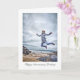 Aufblühende Serie Eine Grüße-Karte mit einer Frau, die vor Freude aus einigen Felsen am Strand springt. Ihre Arme und Beine sind teilweise ausgestreckt und verwandeln sie in einen Krabbensprung. Sie trägt eine gepolsterte Jacke gegen die Kälte, und ihr Haar zieht im Wind an. Mit einem fröhlichen Ausdruck und weiten Augen wirkt der Eindruck von wildem Überschwang. Bildcode: hrcol149