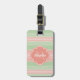 Ein mädchenhaft pastellfarbener Strick-Muster Gepäckanhänger mit korallenrosa Streifen, die Sie personalisieren können, indem Sie Ihren Namen und mit Monogramm Initiale zum vierblättrigen Abzeichen. Dies ist Teil der Nile Green and Blooming Dahlia Strick Collection. Flachbild-Bild NICHT mit Garn oder Spitzen hergestellt.