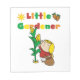 Ein kleines blondes Mädchen schaut hoch, um die Spitze des Maisstals in ihrem Garten wachsen zu sehen, in diesem niedlichen und farbenfrohen Gartendesign auf Bierstühlen, Kissen, Bettdecken, Decken, Pfannkuchen, Tellern, Kissen und vielen anderen Gegenständen.