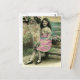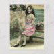 Farbige altmodische Postkarte eines Mädchens, das auf einer Bank sitzt und Wildblumen in einem Korb und einem Bouquet hat.